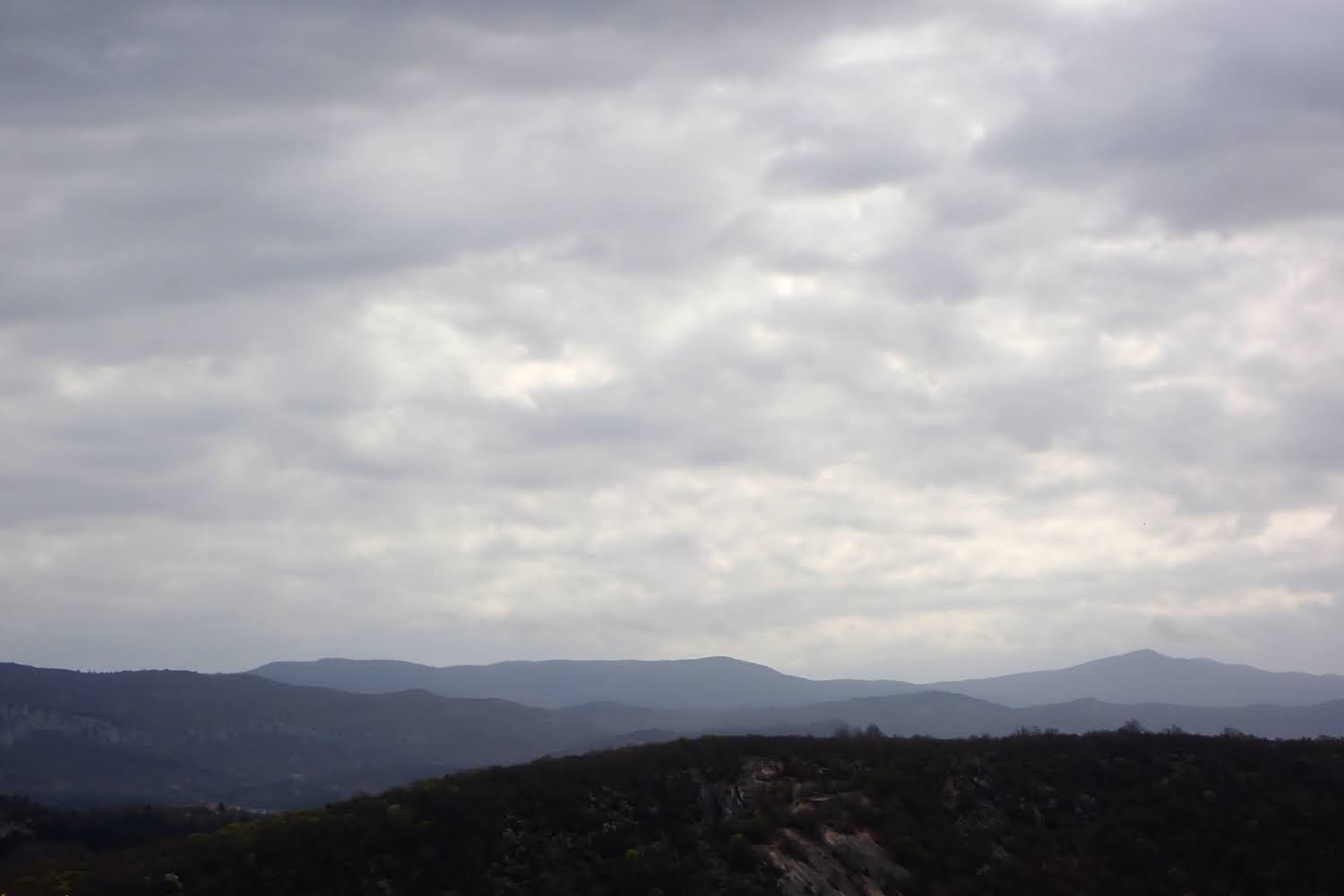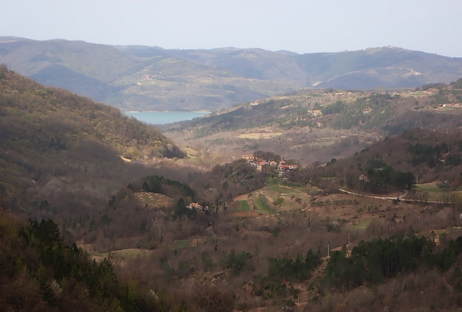 Vozio sam s grupom od nešto manje od deset vozača i lijepo smo gazili. U dolini je ipak manje puhalo, nebo je bilo sivo ali nije bilo hladno i dobro nam je išlo. Za nešto manje od tri sata stigli smo u Buzet, na 77. km rute. Stali smo na benzinskoj crpki, ovjerili kartone, kupili nešto za pojesti i popiti i krenuli dalje, na jug, prema Draguću. Do kojega je oko petnaest kilometara konstantnog penjanja. Nisu to Alpe, visinska razlika je tristotinjak metara, ali ipak, dugo se penjemo. Što inače ne bi bio problem, ali kad čovjek ima ovoliko kilometara za odvoziti s još mnogo ovakvih uspona, ipak gaziš laganije. U stvari sam na usponu stao jednom ili dva puta, da snimim fotku ili dvije, jer je pucao lijep pogled na Učku, ali kako je bilo dosta sivo onda su tako ispale i fotografije.