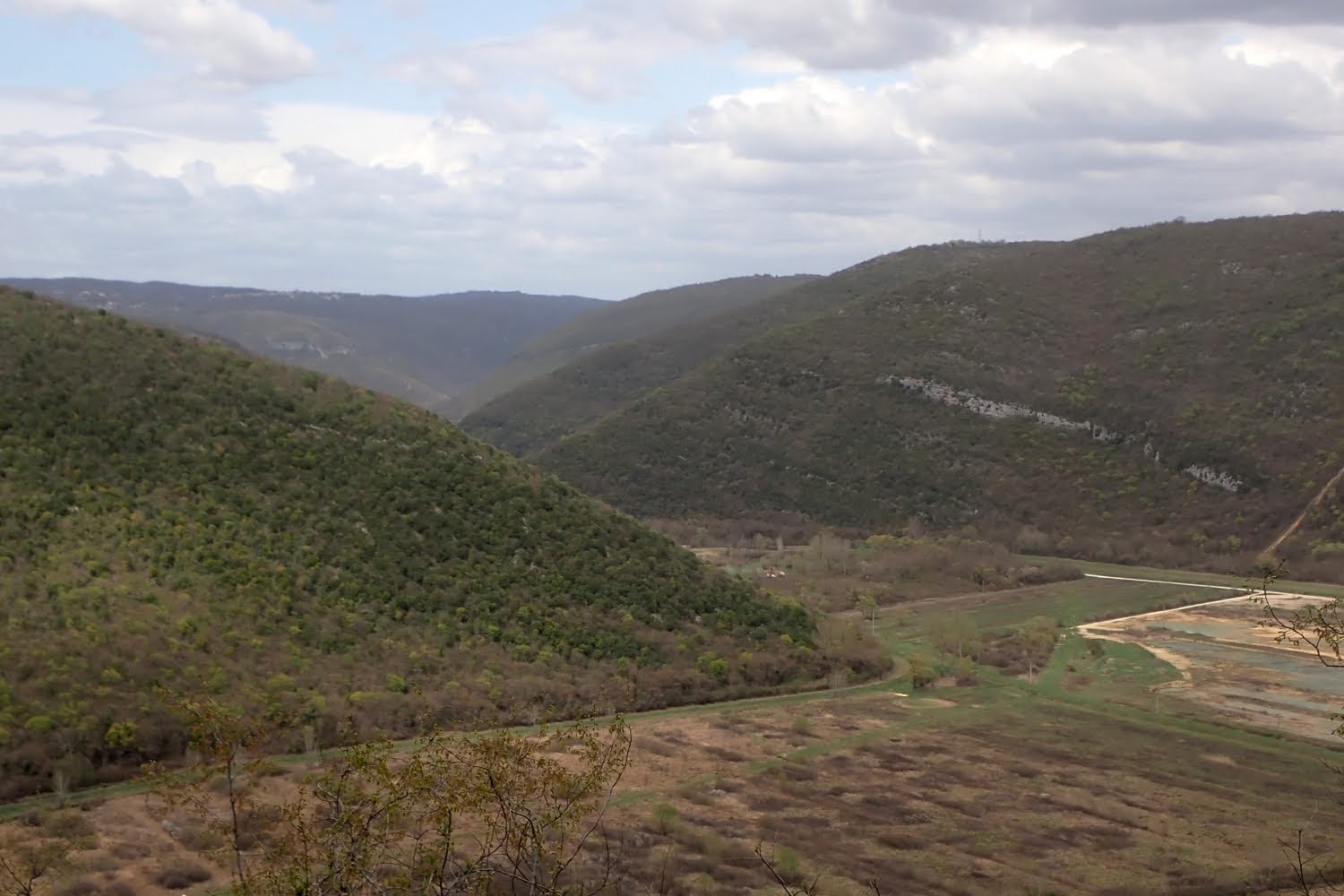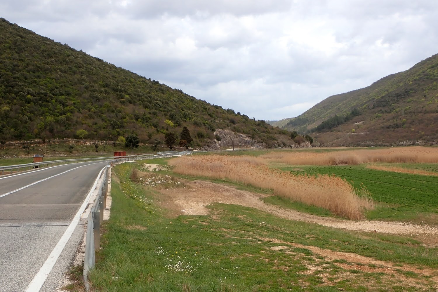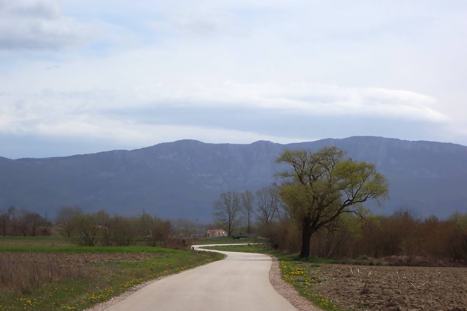 Prije nego što sam se počeo spuštati, zaustavio sam se da snimim nekoliko fotki i dok je nebo na zapadu bilo gotovo bez oblaka istočno nad Učkom visjeli su sivi oblaci. Kako bilo da bilo, spustio sam se u dolinu i ondje me na volej dočekao jak jugoistočnjak. U jednom zavoju me gotovo bacio na tlo, da bi mi nakon toga poprilično bezobzirno puhao u prsa. Vozio sam lijepom dolinom, uz rječicu Karbunu koja će se dalje na jugu uliti u rijeku Rašu. S lijeve strane ceste su bile obrađivane njive, pokoja kuća, stancija, što već. Poneki traktor i ja. 🙂 U jednom sam trenutku naletio na jato galebova koji su se s polja vinuli u zrak i rekao bih, poprilično uživali na vjetru. Za razliku od mene. 🙂
