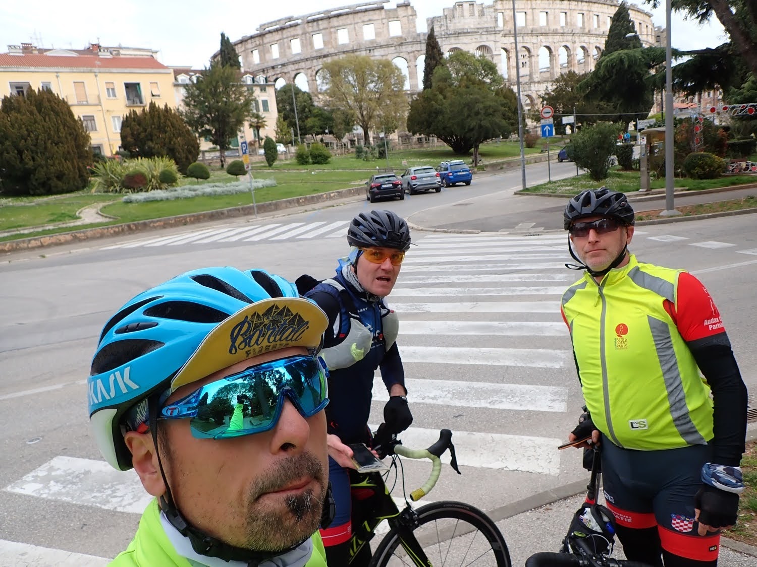 Dakle, moglo je i brže, ali dečki su se malo teže snalazili a ja sam iznenađujuće dobro durao nasrtaje vjetra pa ustvari nismo jurili onoliko koliko smo mogli. Dobro, tih par minuta stvarno nije bitno. U Puli smo prvo rekli da nećemo do Arene, jer nije službena kontrolna točka, ali sam ja ipak rekao da bi trebali, kad smo već tu stvarno nema smisla da ne posjetimo amfiteatar a i da uhvatimo par minuta odmora prije nego krenemo na sjever, opet vjetru na megdan.