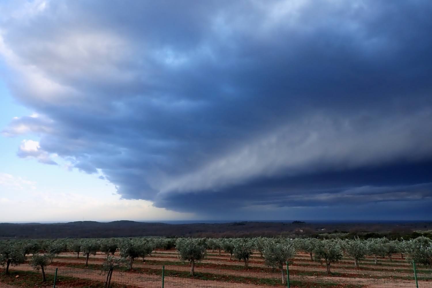 Srećom je Vodnjan samo par kilometara dalje i unatoč tome što sam vozio u smjeru sjeverozapada, dakle u vjetar, ipak nije bio toliko jak jer sam se s manje visine penjao na veću pa je i ta konfiguracija terena nešto pomogla. Sad je već oko 18 sati, temperatura je značajno pala (ispod 10 stupnjeva) i bilo mi je dobrano hladno za prste na rukama i nogama. Oblaci su prijetili, nad morem zapadno od mene već je padala kiša, imao sam jako lijep pogled na dramatičan oblak, koji je izgledao točno onako kako viđam na fotografijama lovaca na oluje iz morskih krajeva. Nakon što sam krenuo iz Vodnjana prema Rovinju, odlučio sam stati na prvom pogodnom mjestu da na sebe navučem kišnu opremu, svjetla i sve što mi treba za noćnu i moguće kišnu vožnju.
