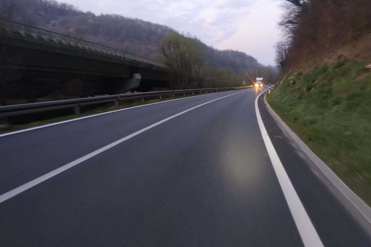 Night had already fallen when the three of us set off. Siniša navigated us to catch the road to Varaždin as quickly as possible. We navigated through traffic, still benefiting from the weakened, but southerly wind at our backs. The sky wasn’t completely overcast yet; the moon peeked through the clouds. I led our little column, and everything was fine until we reached Sveti Ivan Zelina. Traffic was thinning out, we were riding at a decent pace, and somehow I still hoped we’d manage a good portion of the journey without rain.
