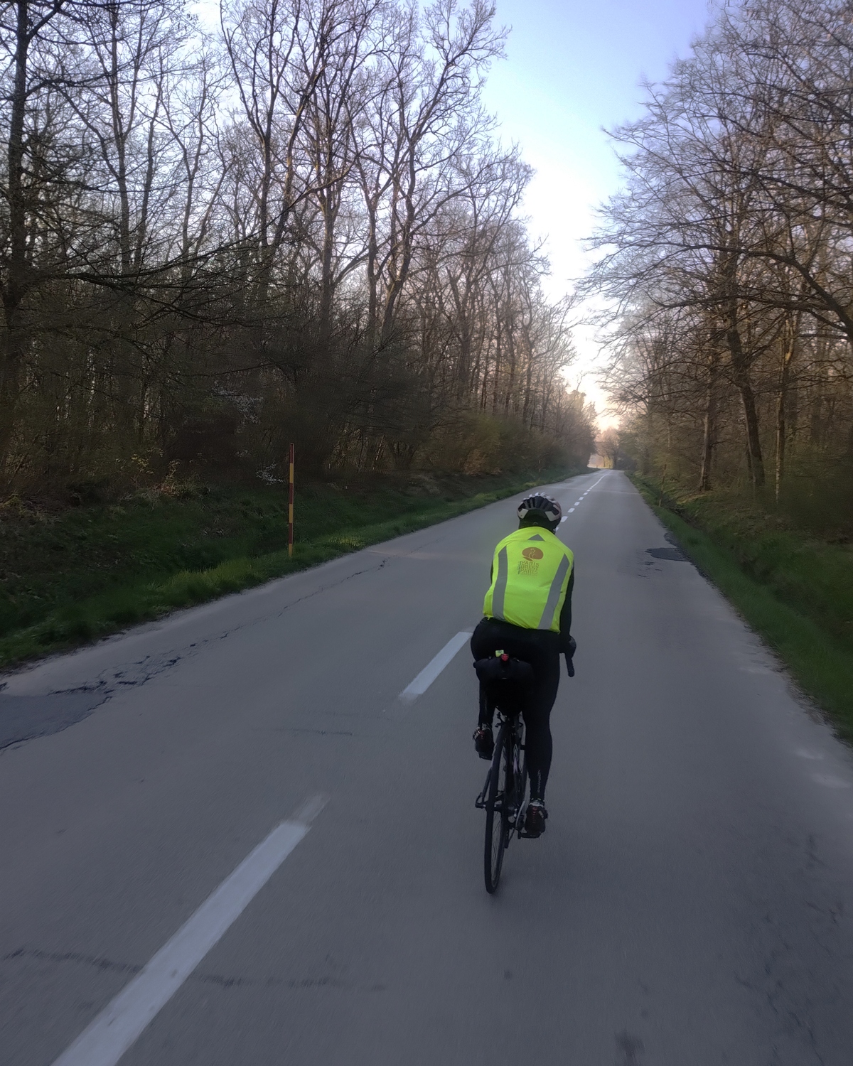 Alright, as I started climbing, near the top of the hill, I saw the yellow jersey that Dadek was wearing, just like me, in fact. Our team jersey from last year’s Fleche. I caught up with him and waited a bit for us to continue together. But he preferred a slower pace, so I continued on my own. A few more hills, and I reached the “Happy Point” where riders were greeted with some drinks. I glanced at them, but I saw that some may have relaxed a bit too much, some were chugging beers from cans, and I spotted those familiar white legs that had started downhill just before I arrived.