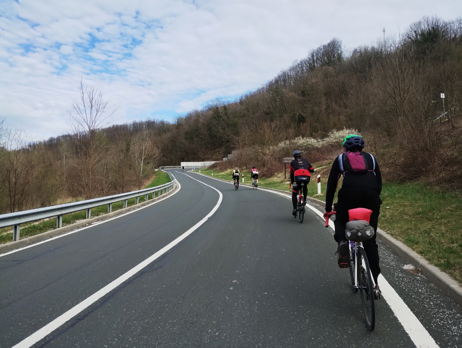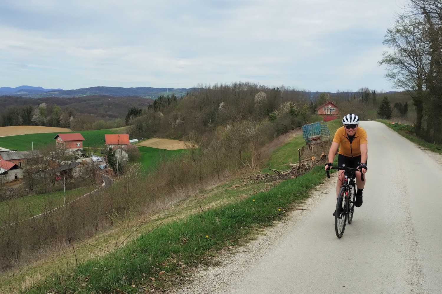 Don’t get me wrong, I’m not judging the crew who chugged a beer, to each their own. Not so long ago, I would’ve joined them. 🙂 I just didn’t feel like crowding, and I wanted to finish the brevet as soon as possible. Anyway, I’ll take a longer break in Vrbovec, which isn’t that far away. Shortly after the descent, I caught up with Tom, the owner of the white legs. 🙂 I asked him if he’s coming with me, and he said he’ll try. And so the two of us continued towards Vrbovec, me in front, him in my slipstream. The wind was felt more from the side as we traveled southeast. Still, every now and then, it nudged us on a bend when the terrain opened up to expose us from the side.