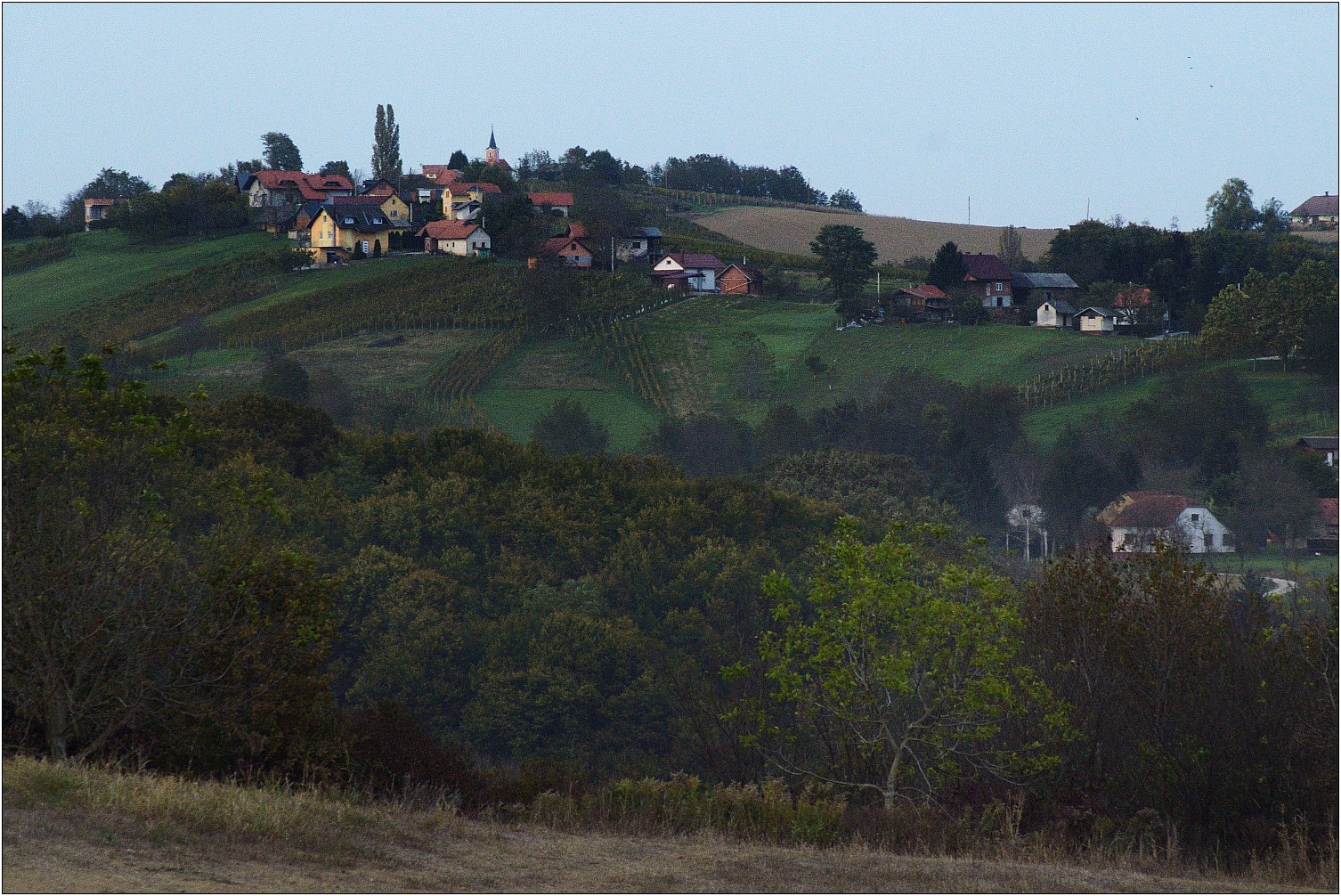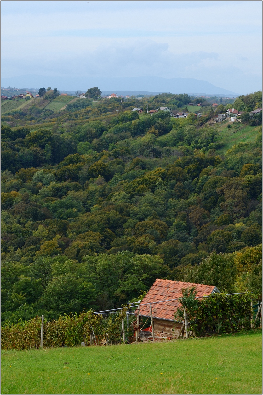 Mnogo je ovakvih malih vikendica/kleti po našim bregovima. Ovdje gledamo na zapad, silueta planine u pozadini je Pohorje, u Sloveniji.