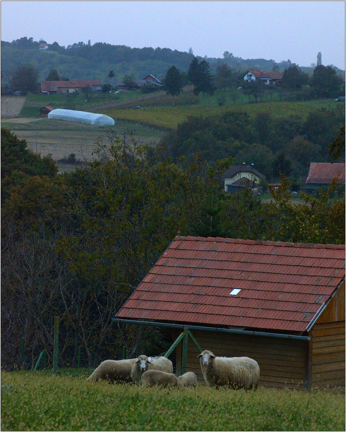 I za kraj sivog i oblačnog dana ovce u krajoliku.