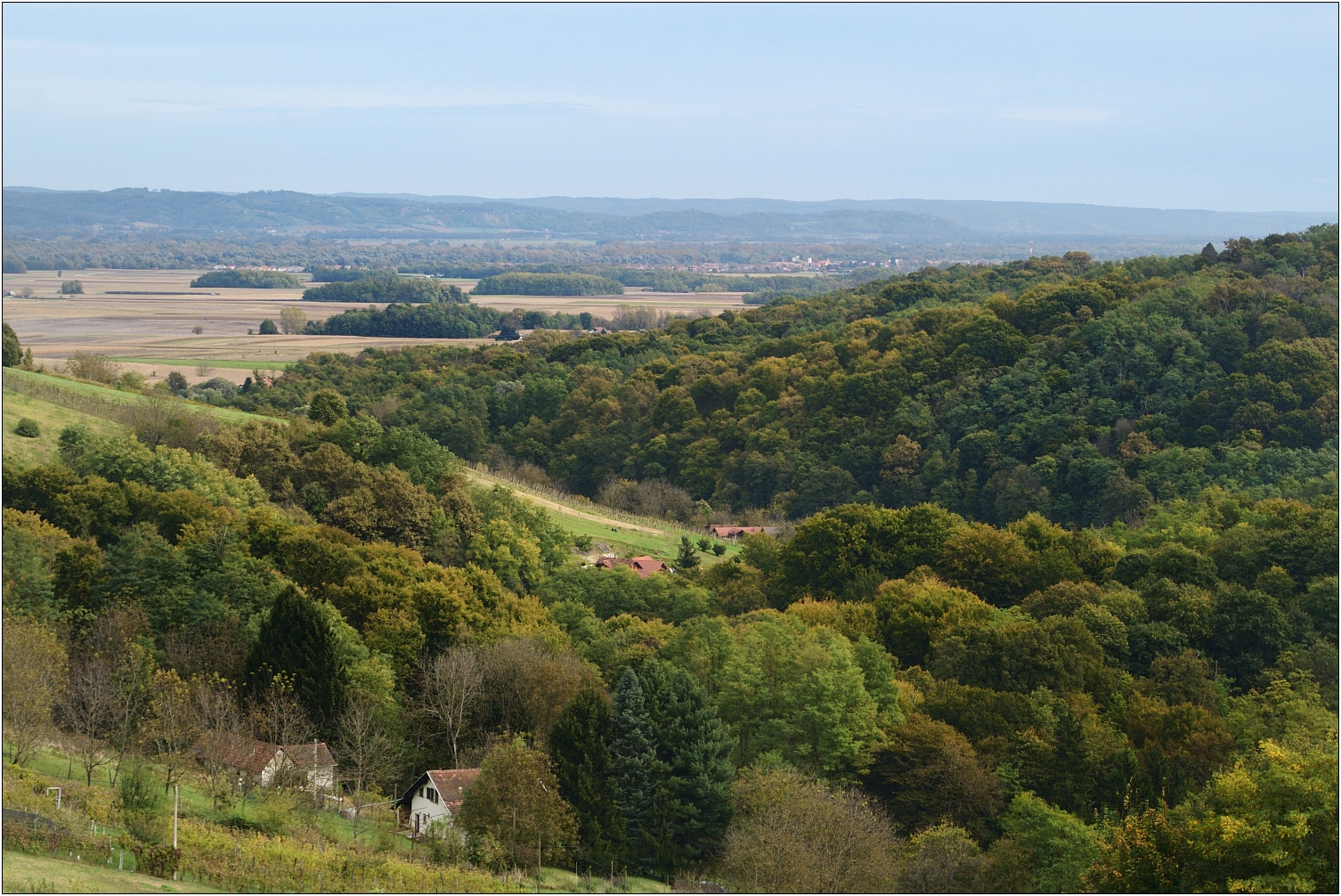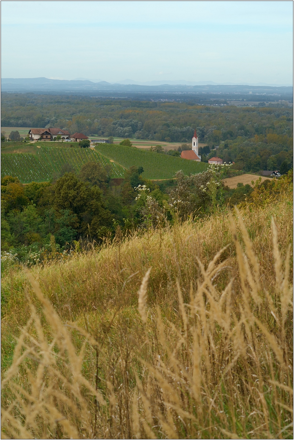 Slovensko mjesto Razkrižje je ispod nas, a skroz u daljini naziru se vrhovi planina u Austriji. Gledamo na sjeverozapad.
