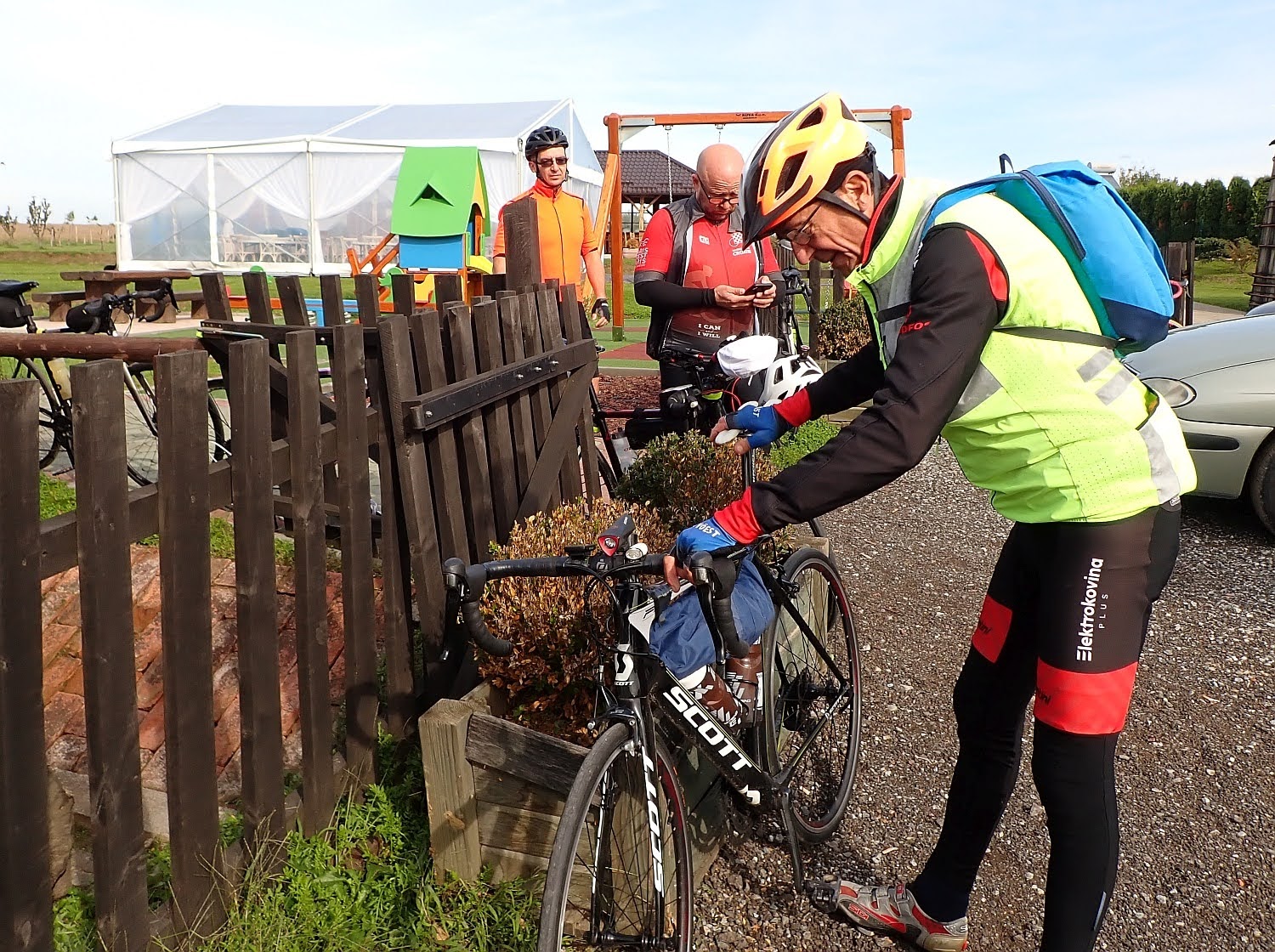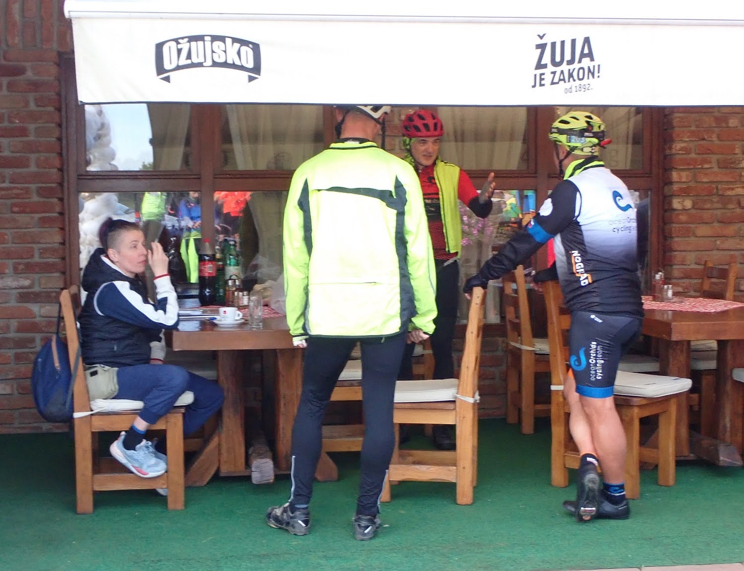 Među gostima muvaju se i biciklisti, iz automobila vade stvari, pozdravljaju se, upoznaju se oni koji do sad nisu vozili zajedno, pripremaju bicikle. Neki su sami, s nekima su partnerice, bolje polovice ako tako hoćete. 🙂 Organizator je pripremio klipiće, sendviče, voće koje uglavnom ne uzimamo. Riješio sam prijavu i otišao na kavu.