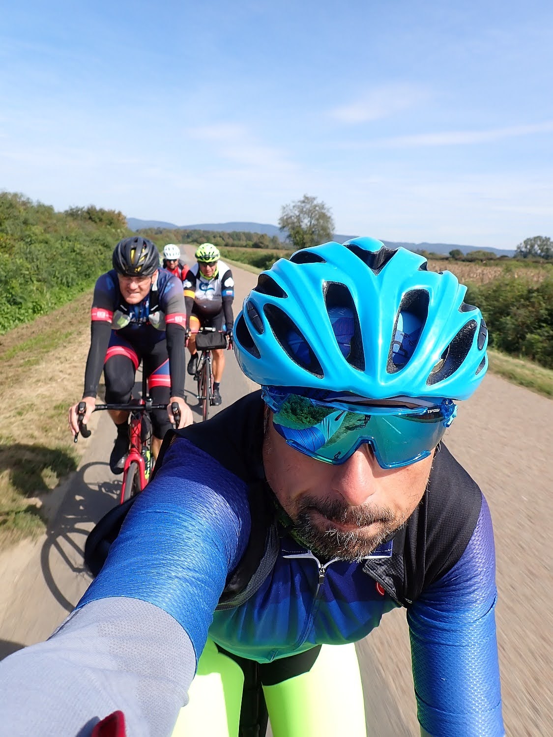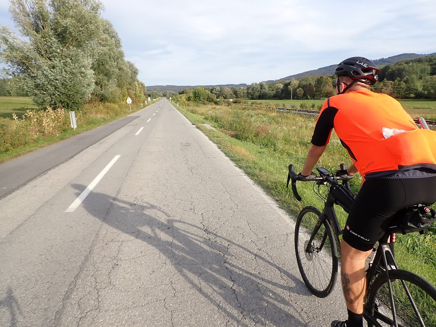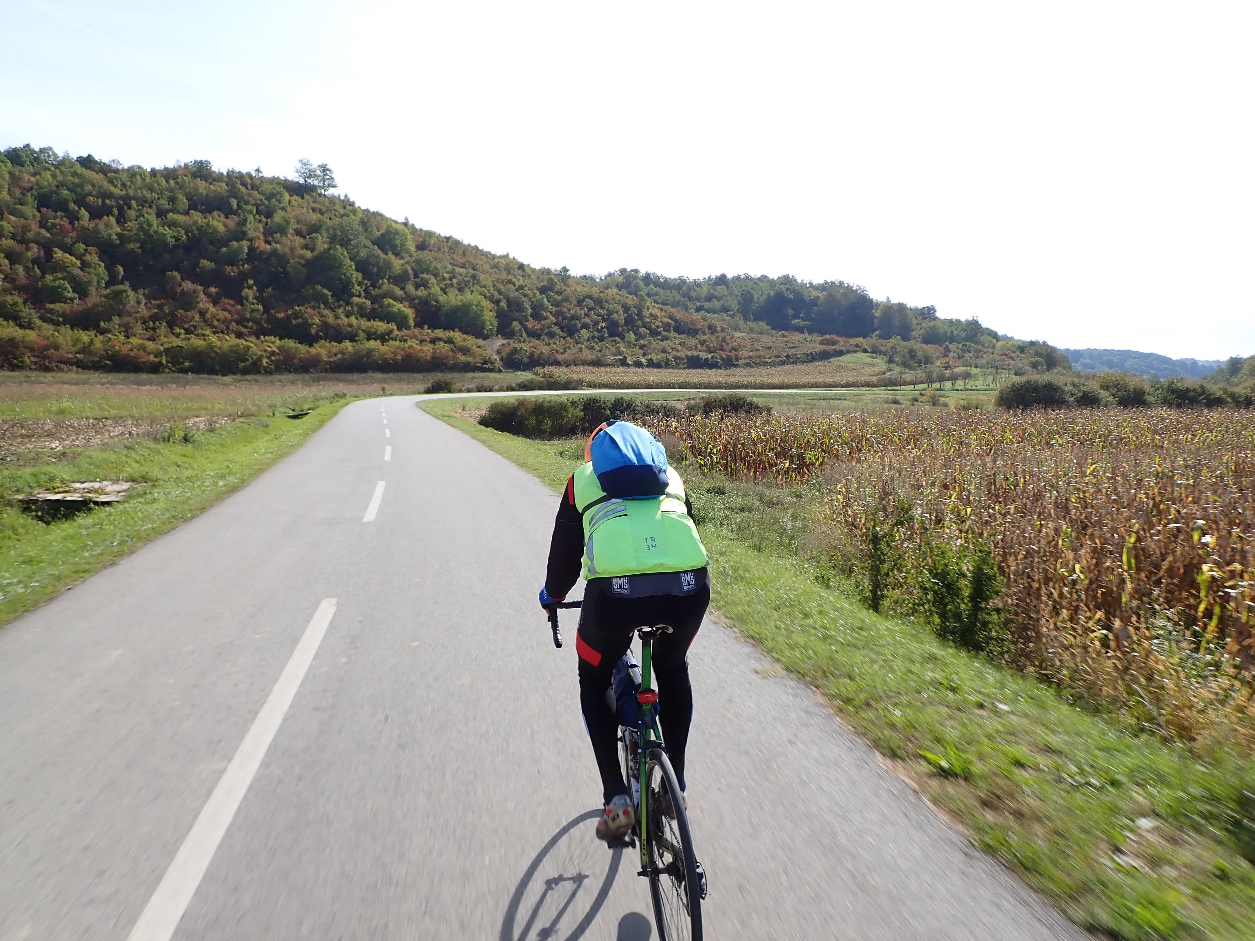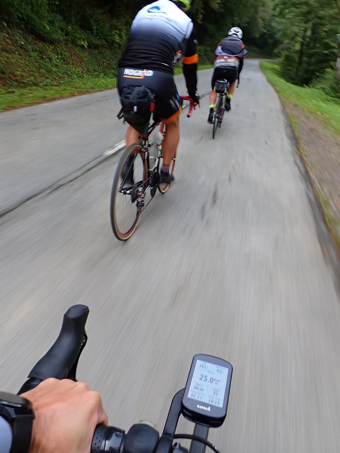 Gazili smo deda i ja pristojnim tempom na lagano valovitom terenu, ja nisam želio prejako tiskati, vozili smo oko 30 km/h, da bi nas nakon desetak kilometara stigla skupina od četvorice koju smo ostavili na usponu.