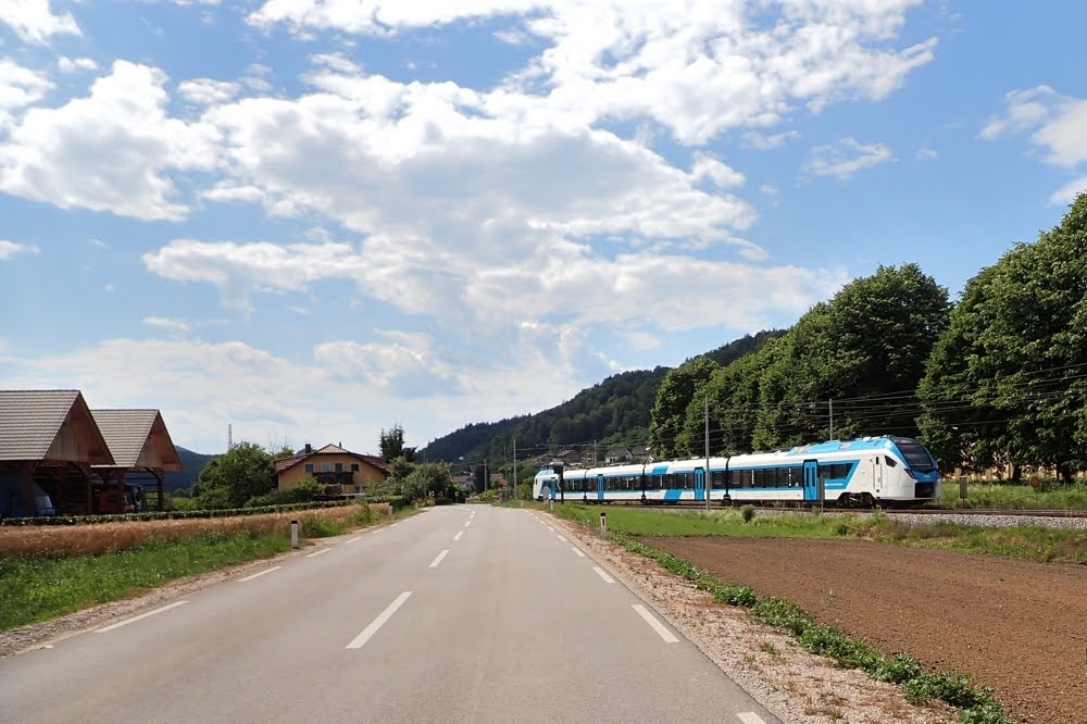 Odande me put vodio uz rijeku Savu, na zapad. Naravno da sam fulao skretanje na sjevernu cestu koju sam odabrao da izbjegnem brzi promet na južnoj, magistralnoj. Iako bi s južne bili ljepši pogledi na mjesta uz rijeku, ipak sam se odlučio na sigurniji i mirniji prilaz prema Sevnici do koje je bilo još desetak kilometara. Cesta je opet vodila uz željeznicu, koja je ovdje dvotračna. Kako sam kod nas fulao onaj putnički vlak, potrefilo mi se donekle, da snimim putnički koji je predamnom prešao cestu. Napravio sam nekoliko snimaka kad je vlak bio i bliže, ali ova je nekako najbolje ispala. Imao sam do Sevnice još jedan sastanak, ovaj put s teretnim vlakom, ali opet sam taman malo zakasnio da ga snimim kako treba.